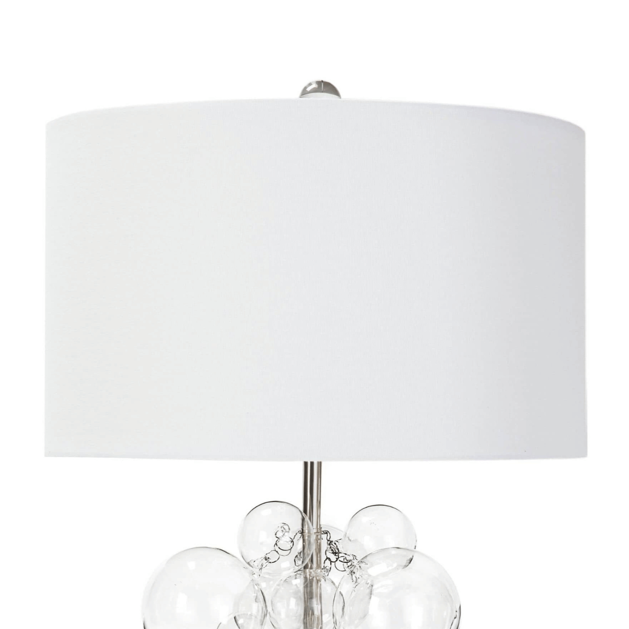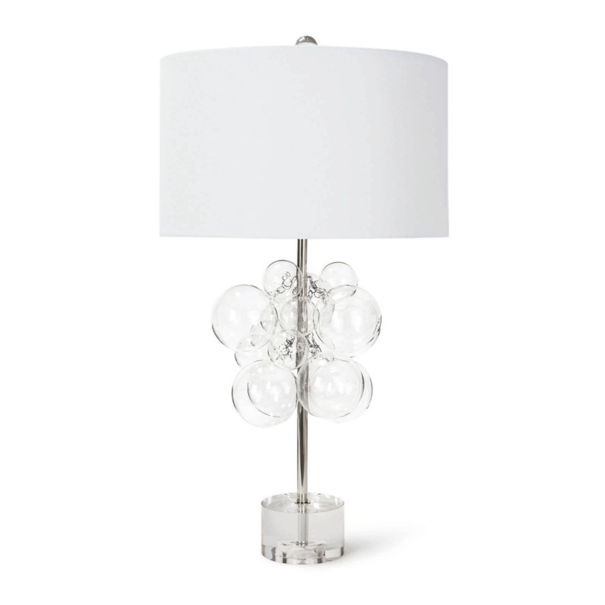 Float away with the Bubbles Table Lamp. Clear glass spheres adorn a thin polished nickel rod base, and the crystal pedestal sets the whole piece off luxuriously. Show off your fun side by installing this lamp in a living room for an unexpected detail.