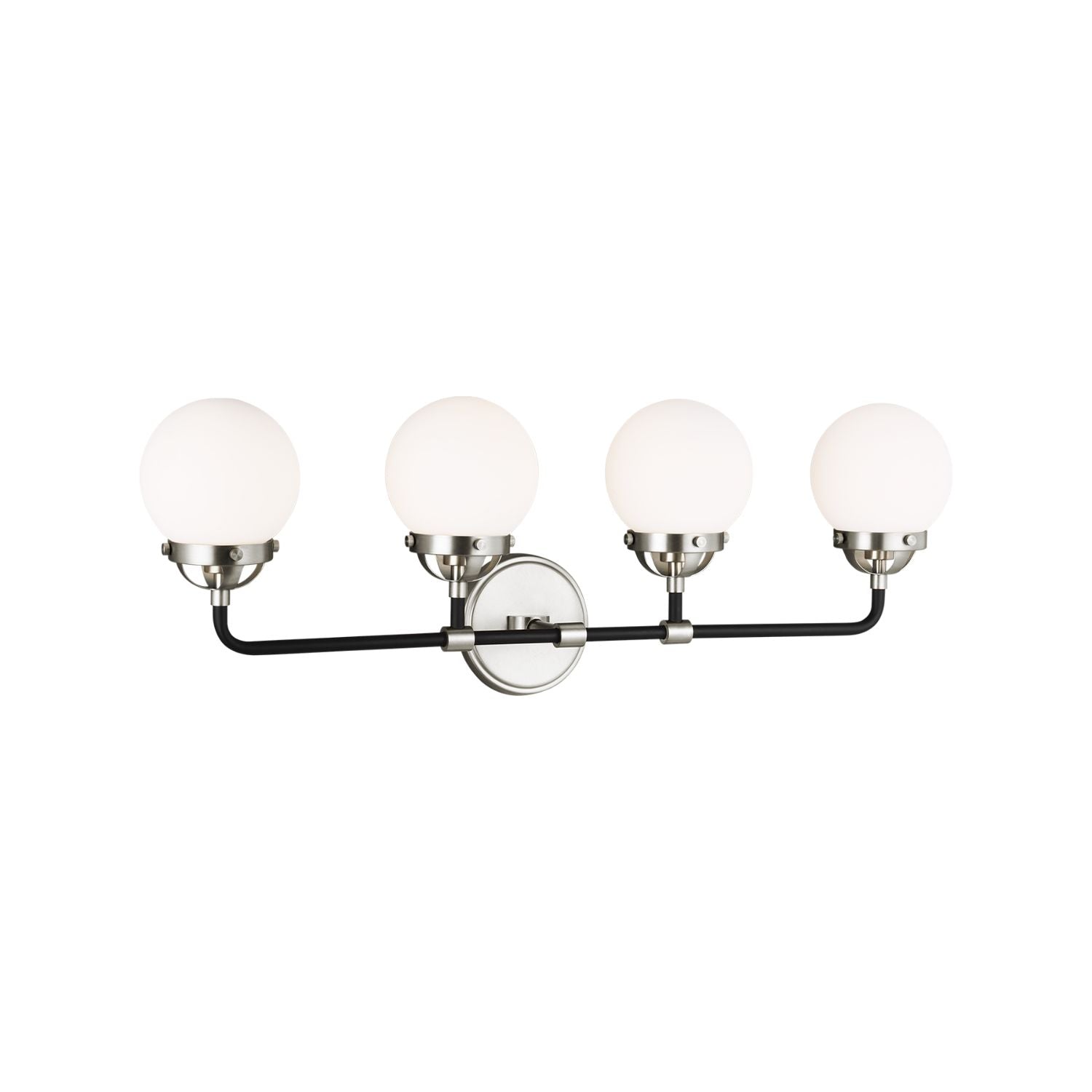 The Café Four-Light Wall/Bath Sconce showcases a sophisticated two-tone finish with sleek white glass globe shades. Perfect for larger bathrooms or statement walls, it offers ample, stylish illumination with a modern flair.