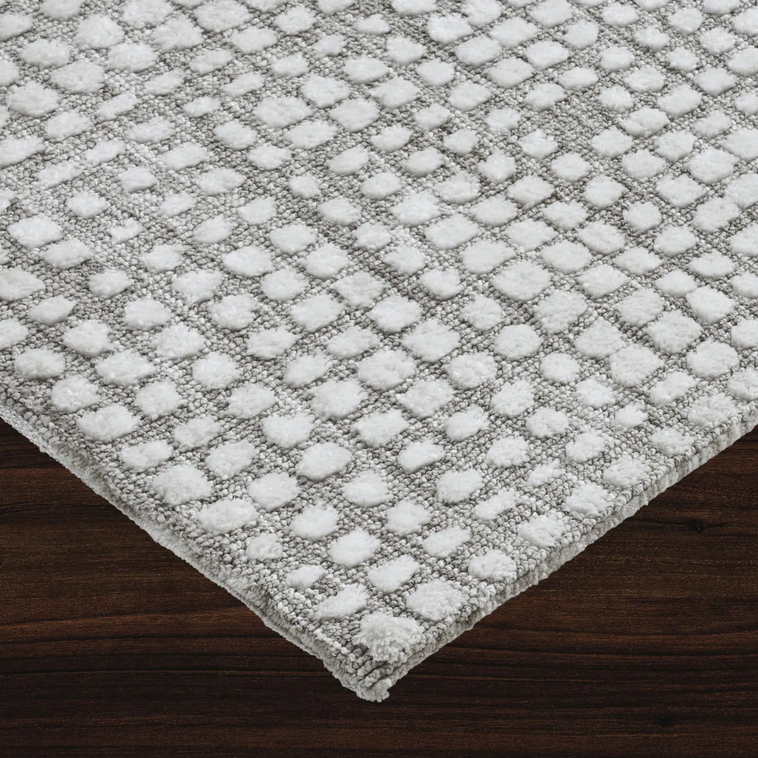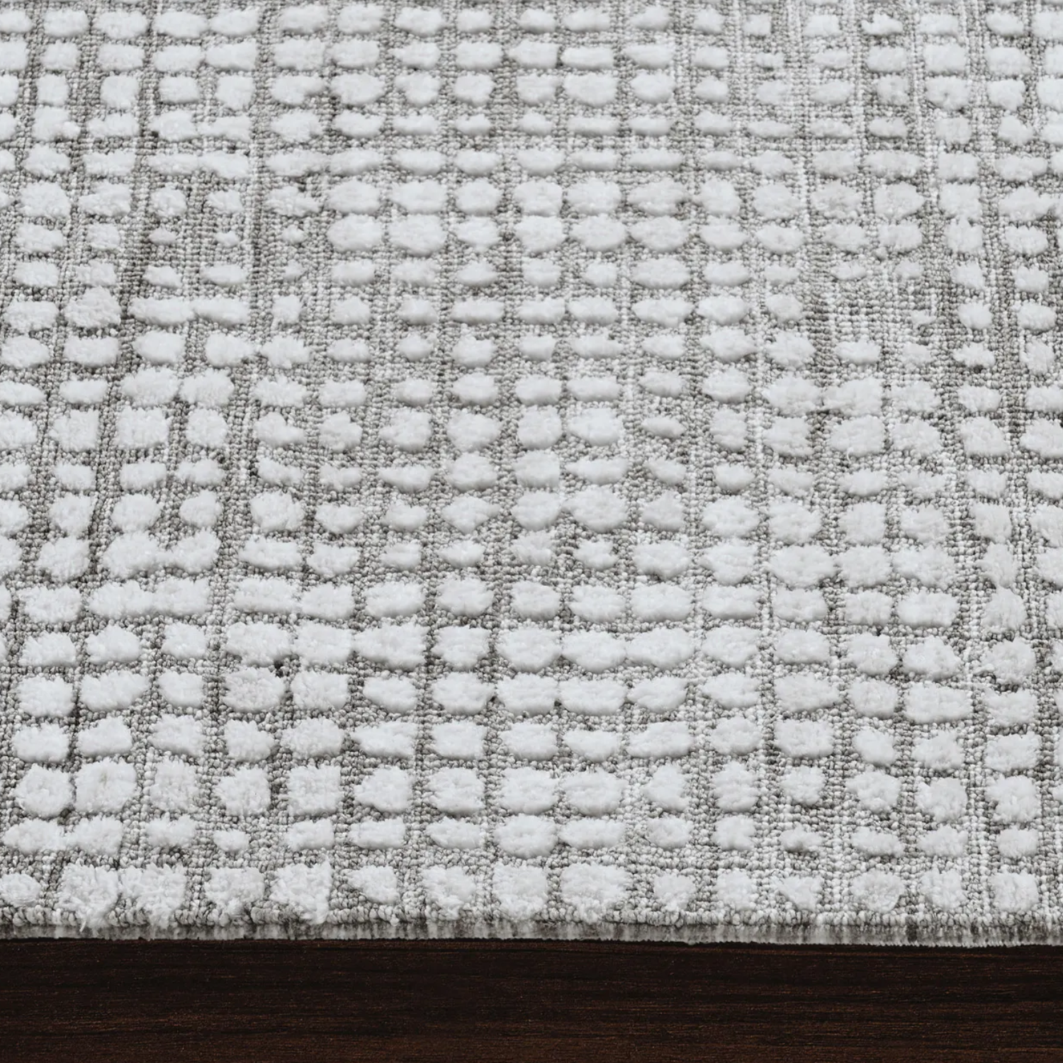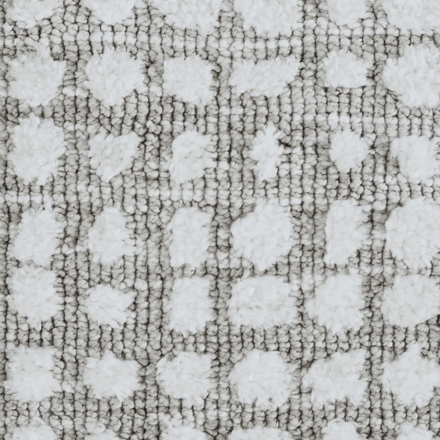 This rug design holds equal beauty in every dimension. Composed of machine knitted micro polyester, it has a unique structure that incorporates texture to the space and the touch. With timeless neutral tones of taupe and ivory coming together in every square, it holds an effortless style fit for the luxe living space.