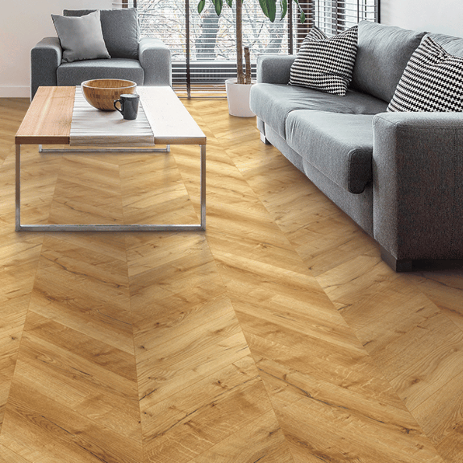 The Twelve Oaks Chevron Surewood collection combines ease of installation and superior durability with innovative features like the Välinge 5G® locking system and a high-density, waterproof core. Its authentic grain embossing ensures visual continuity, while the commercial-grade wear layer guarantees long-lasting performance. With built-in cork underlayment for added comfort and antimicrobial protection, this eco-friendly, child-safe flooring is phthalate-free and FloorScore certified. Colour-match with ease to Surewood, Surewood Plus, and Surewood Pro collections, offering endless design possibilities.