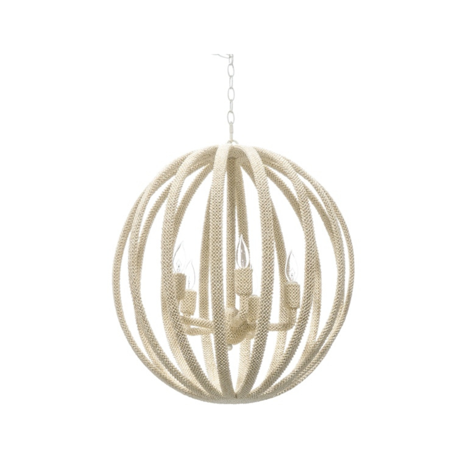 Classic metal chandelier silhouette fully covered with tiny woven coco beads in a soft white finish. Chandelier comes with an off-white finished chain and canopy hanging kit. Professional installation recommended.